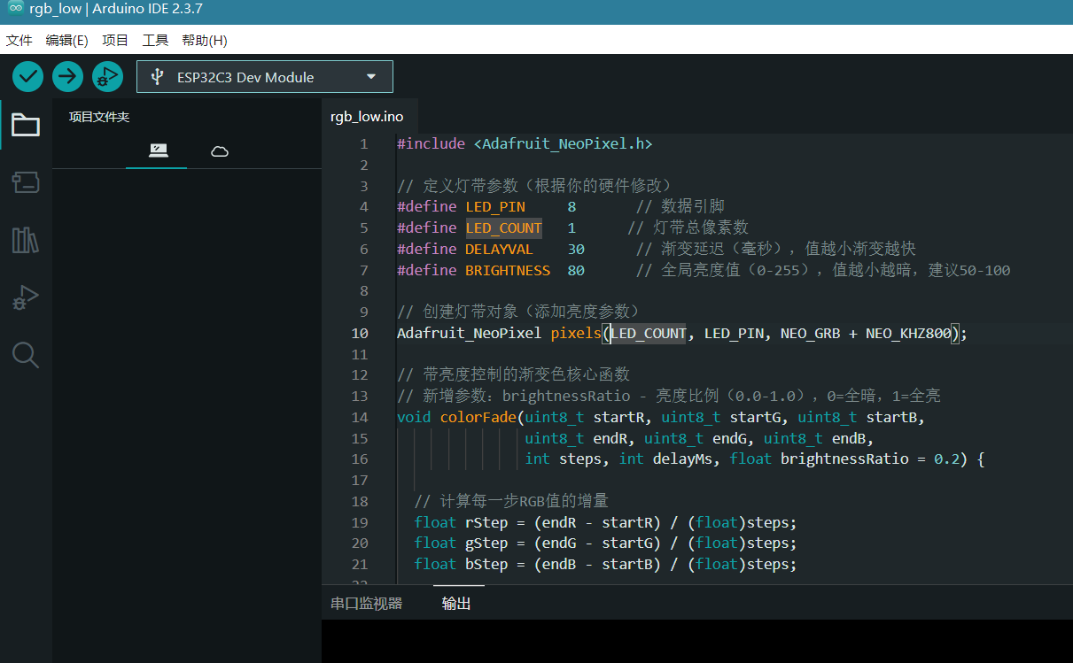 最后附上,基于Arduino开发方式实现的,RBG全彩渐变色代码: