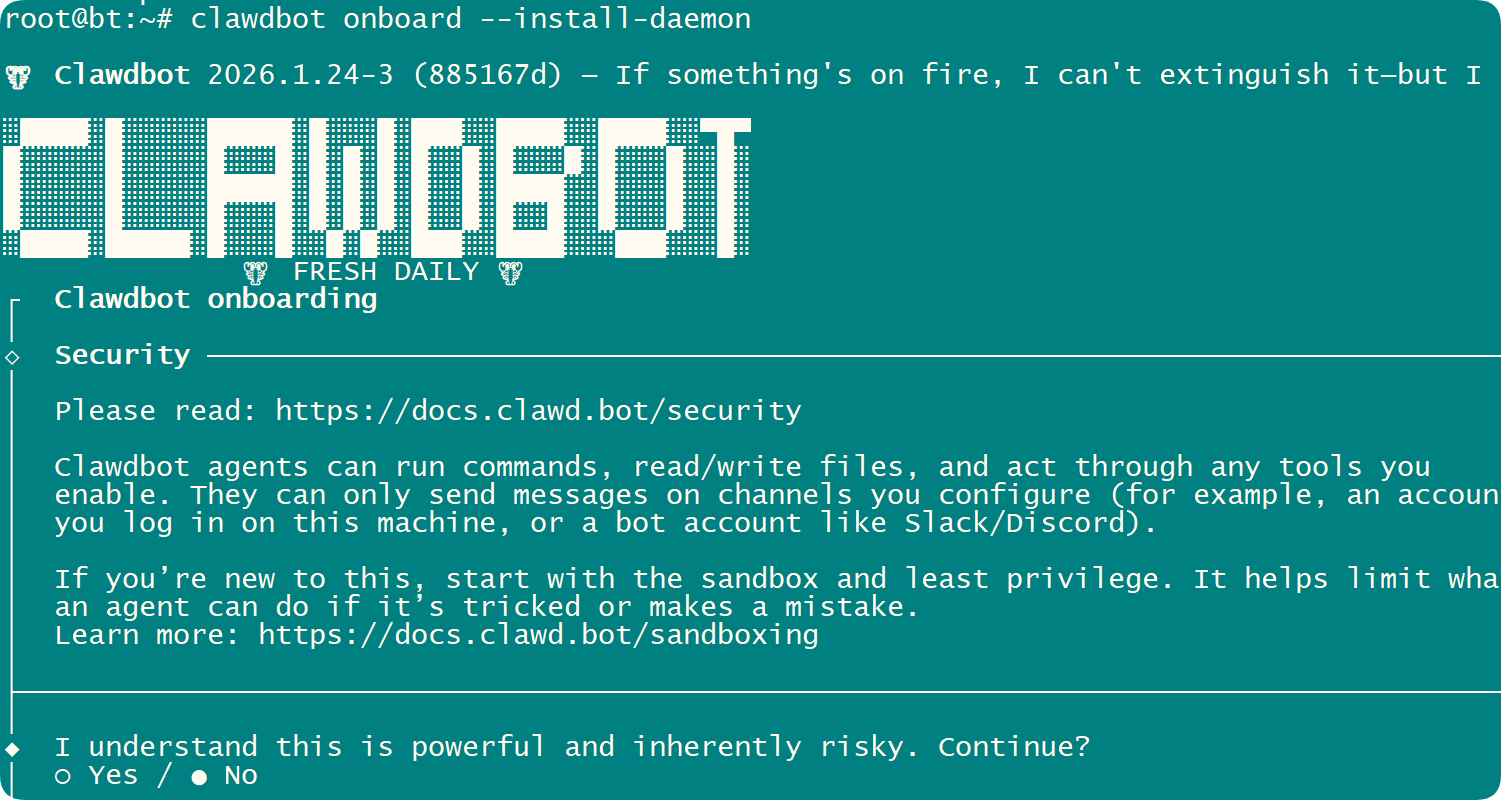 输入 clawdbot onboard --install-daemon(脚本安装会自动进入向导,可跳过此步);