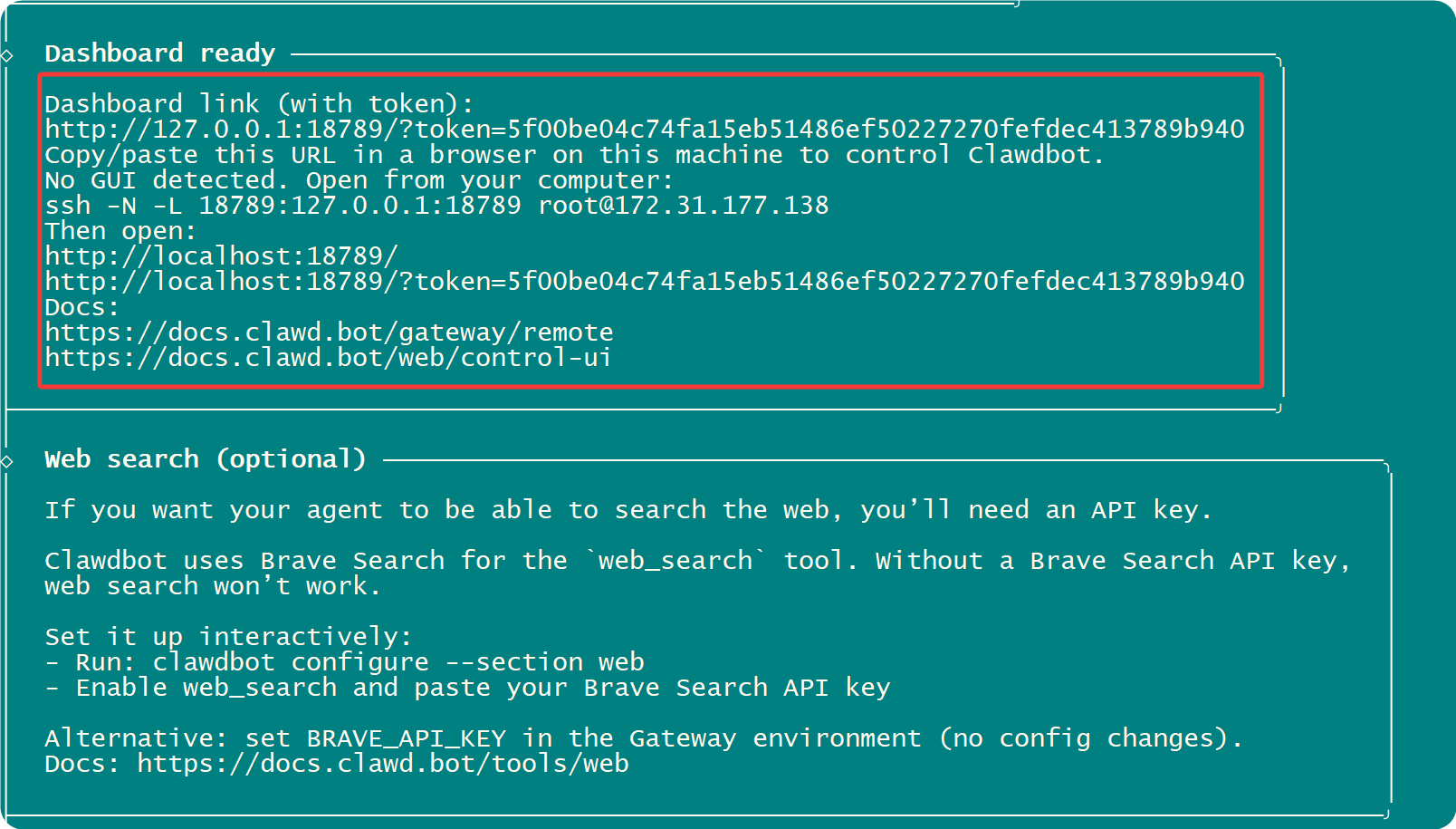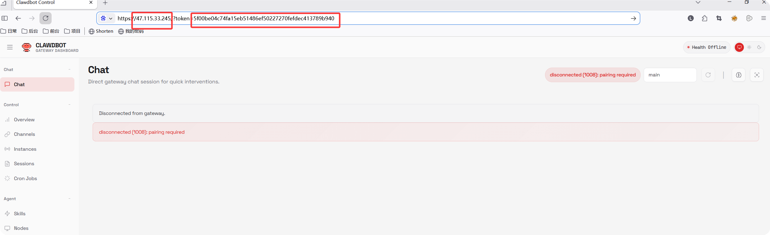 拼接访问链接:将之前保存的 Token 替换到链接中,格式为 https://你的IP/?token=xxx,访问即可进入 ClawdBot 控制台。