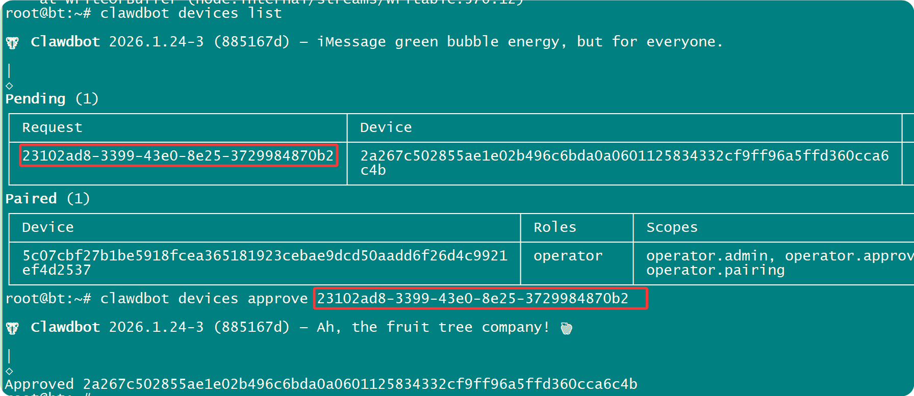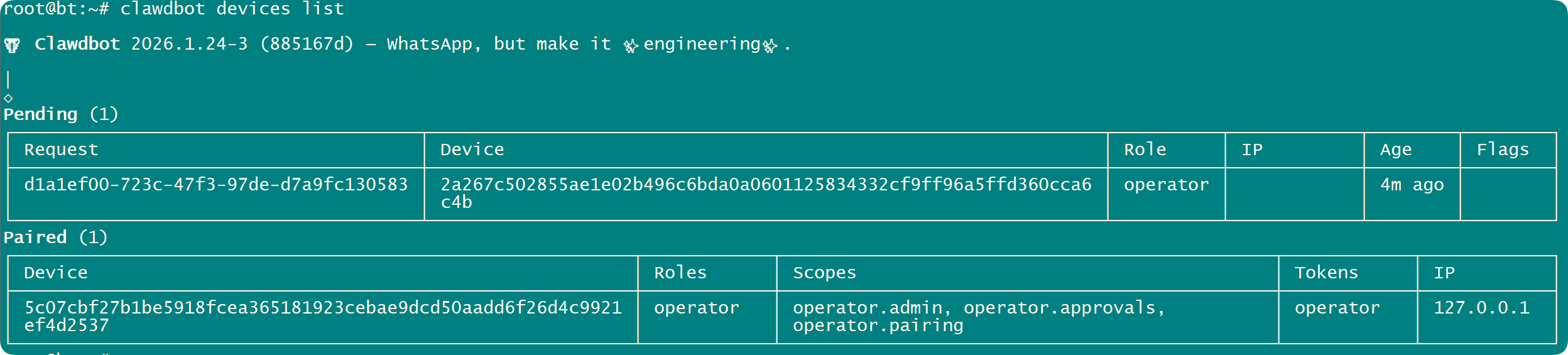 访问控制台后,回到 SSH 终端,输入 clawdbot devices list 查看待授权设备