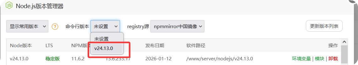 安装 Node.js:登录宝塔面板,进入「网站 > Node 项目 > Node 版本管理器」,更新版本列表后安装稳定版 v24.13.0,并设置为命令行版本;
