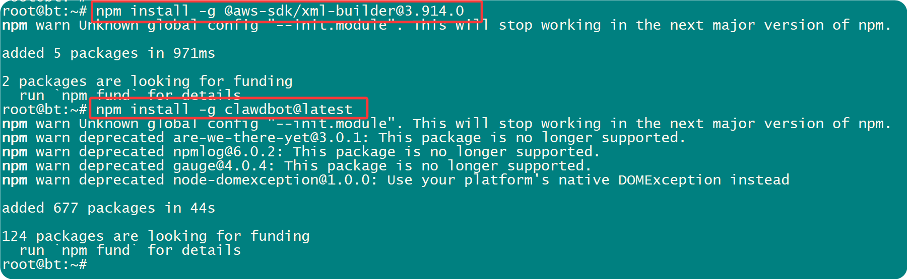 root@iZwz93bflcar7tzp0u7fw1Z:~# npm install -g clawdbot@latest