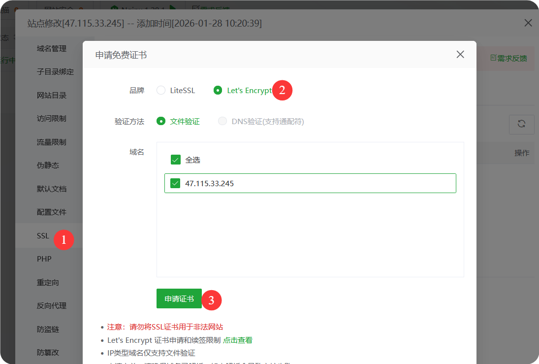 进入站点设置「SSL」,申请 Let's Encrypt 免费证书(IP 类型域名需文件验证),开启 HTTPS;