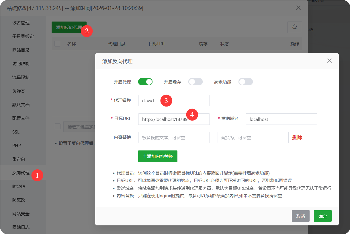 点击「反向代理 > 添加配置」,代理名称填 "clawd",目标 URL 输入 http://localhost:18789,发送域名填 "localhost",保存即可;