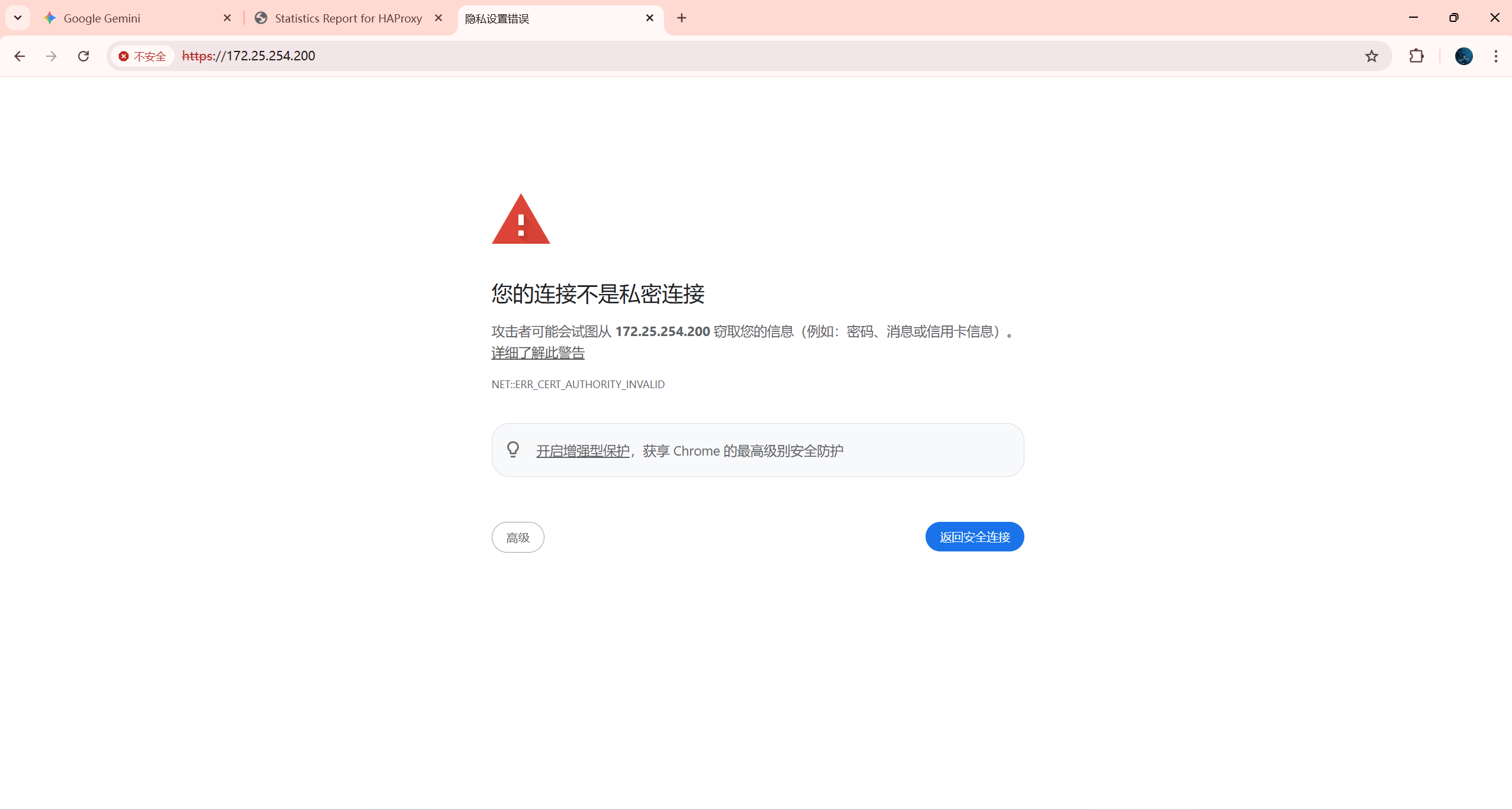 浏览器会弹出一个巨大的红色警告"连接不安全"(因为证书是自己造的)。