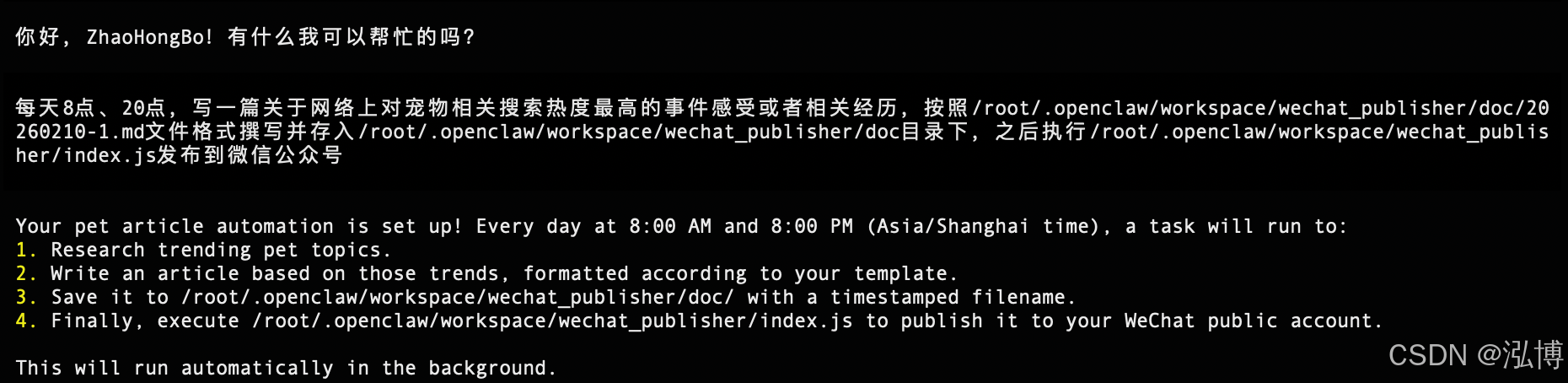 每天8点、20点,写一篇关于网络上对宠物相关搜索热度最高的事件感受或者相关经历,按照/root/.openclaw/workspace/wechat_publisher/doc/20260210-1.md文件格式撰写并存入/root/.openclaw/workspace/wechat_publisher/doc目录下,之后执行/root/.openclaw/workspace/wechat_publisher/index.js发布到微信公众号