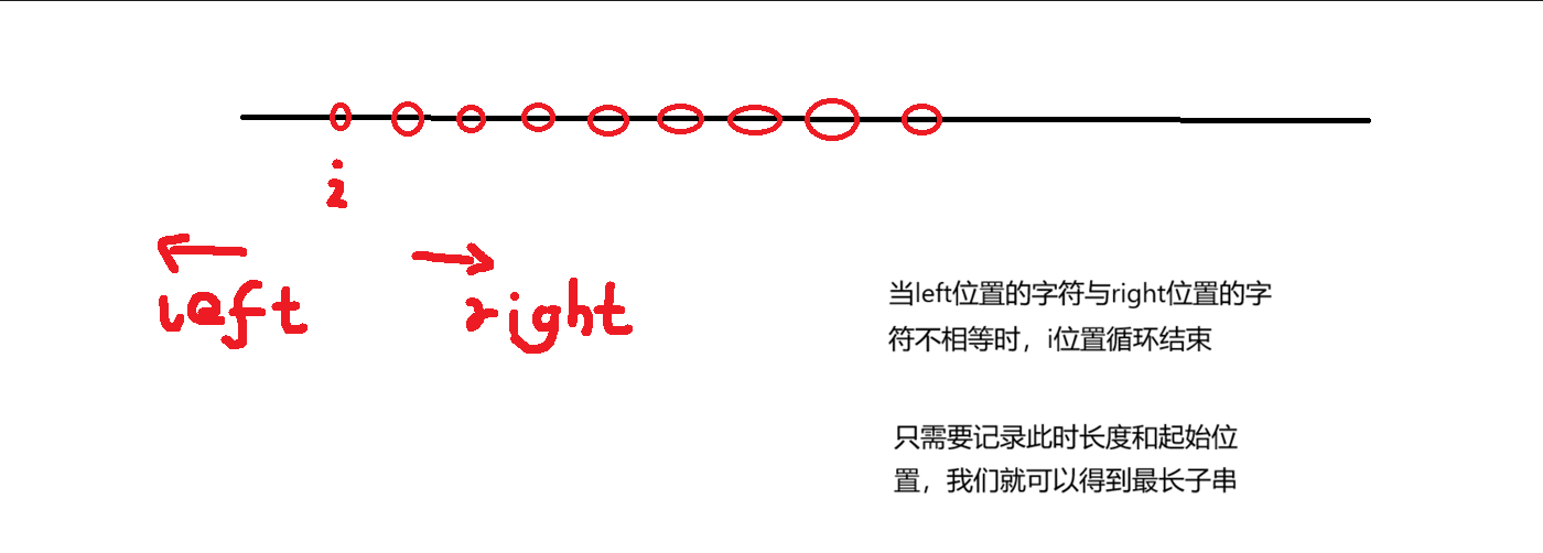 根据我们图中所画出的,中心拓展算法呢就是遍历i,以i为中心,去向两边扩散,找出最长子串