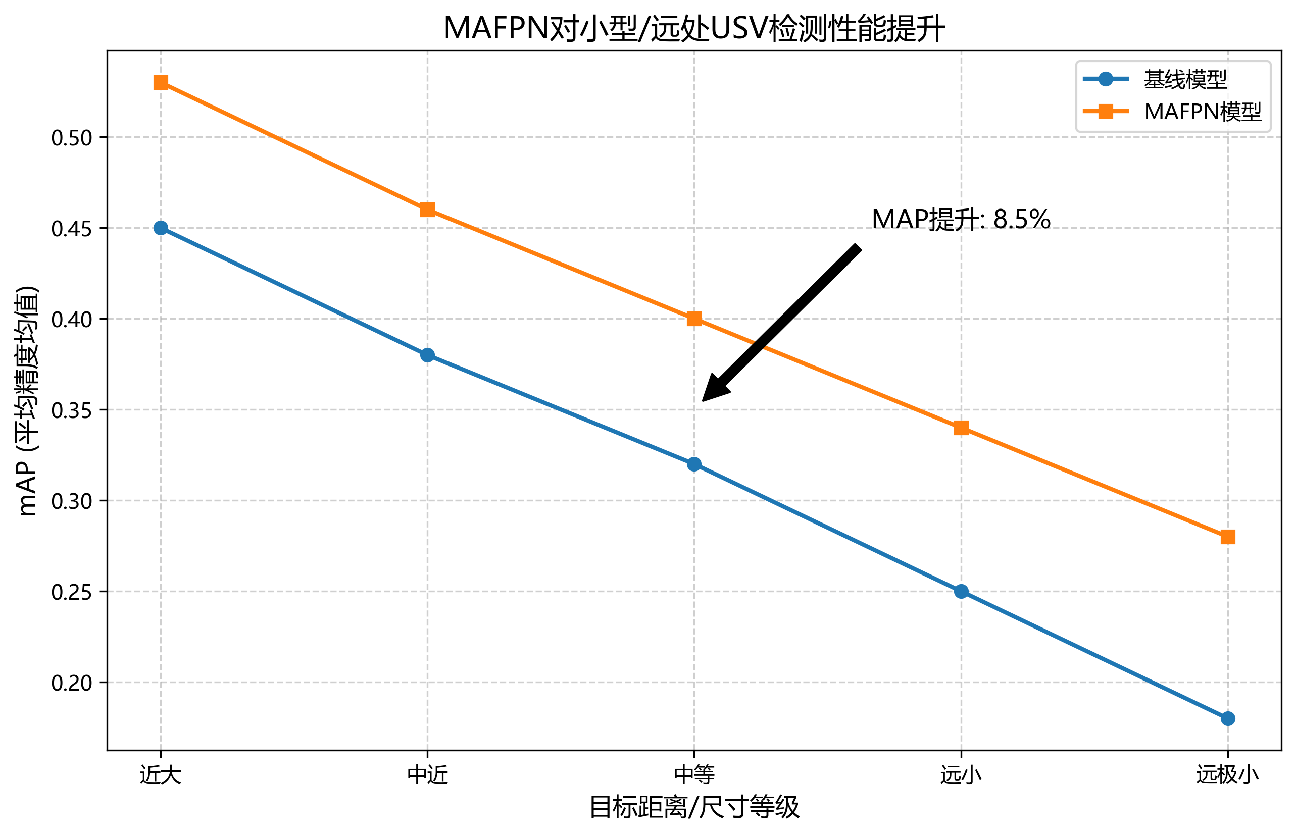 实验结果表明,MAFPN的引入显著提升了模型对远处或小型USV的识别能力,小目标检测的mAP指标提高了约8.5个百分点。这一改进对于实际应用中远距离监控和预警具有重要意义,因为远距离USV的早期发现往往是安全预警的关键。