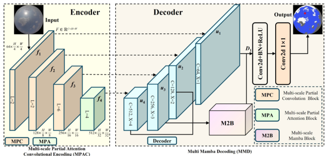 本文针对地面云图像分割在光伏功率预测中的关键需求,指出当前方法存在三大缺陷:(1)基于空洞卷积的多尺度建模忽视通道与空间特征的部分有效性及跨通道互操作性;(2)注意力机制未兼顾精度与吞吐量平衡;(3)解码器缺乏对层级局部特征间全局依赖的建模,导致上下文丢失与推理低效。为此,提出MPCM-Net:编码器引入多尺度部分注意力卷积(MPAC),含多尺度部分卷积块(MPC)与多尺度部分注意力块(MPA),实现高效全局空间交互与判别性特征提取;解码器采用多尺度Mamba模块(M2B),通过空间-语义混合域(SSHD)在线性复杂度下聚合跨空间与跨尺度深层特征;同时发布首个面向辐射源、颜色属性与尺度复杂性的细粒度标注数据集CSRC。