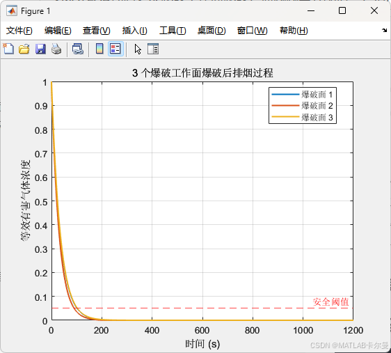 - 计算各爆破面达到安全浓度阈值 ( 0.05 ) (0.05) (0.05)所需时间
