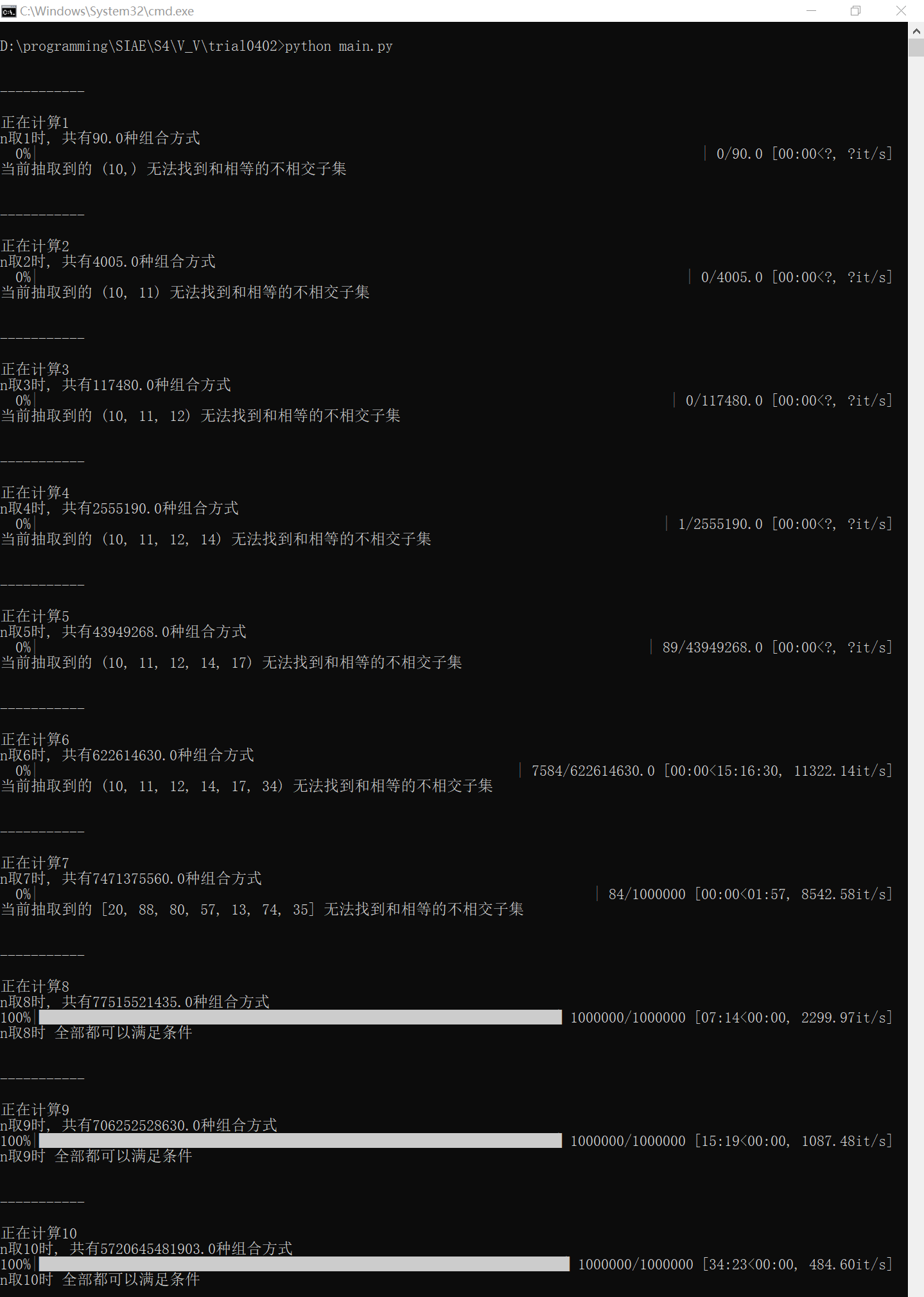27行的断点,在超过3000000次运行过程中均未触发。 - 理论依据:任何求和相等的相交子集对,都能找到其对应的、前置的求和相等的不相交子集对,而这个前置子集对被找到时,程序即已停止迭代。