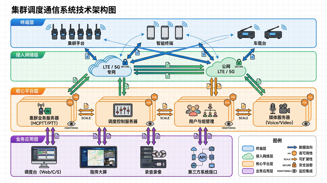 很多人对它的第一印象仍停留在"高级对讲机",但在 4G / 5G、云化和专网快速发展的今天,现代集群通信系统早已演进为融合语音、视频、数据和指挥调度的一体化通信平台。
