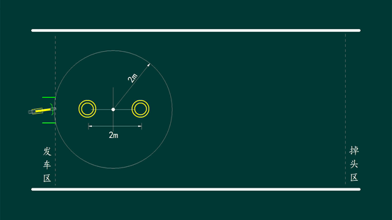 车模从发车区发车, 要求在半径为 2米 的圆内完成锥桶八字绕桩行进。 两个锥桶之间的间隔为2米。 发车区的宽度为一米。