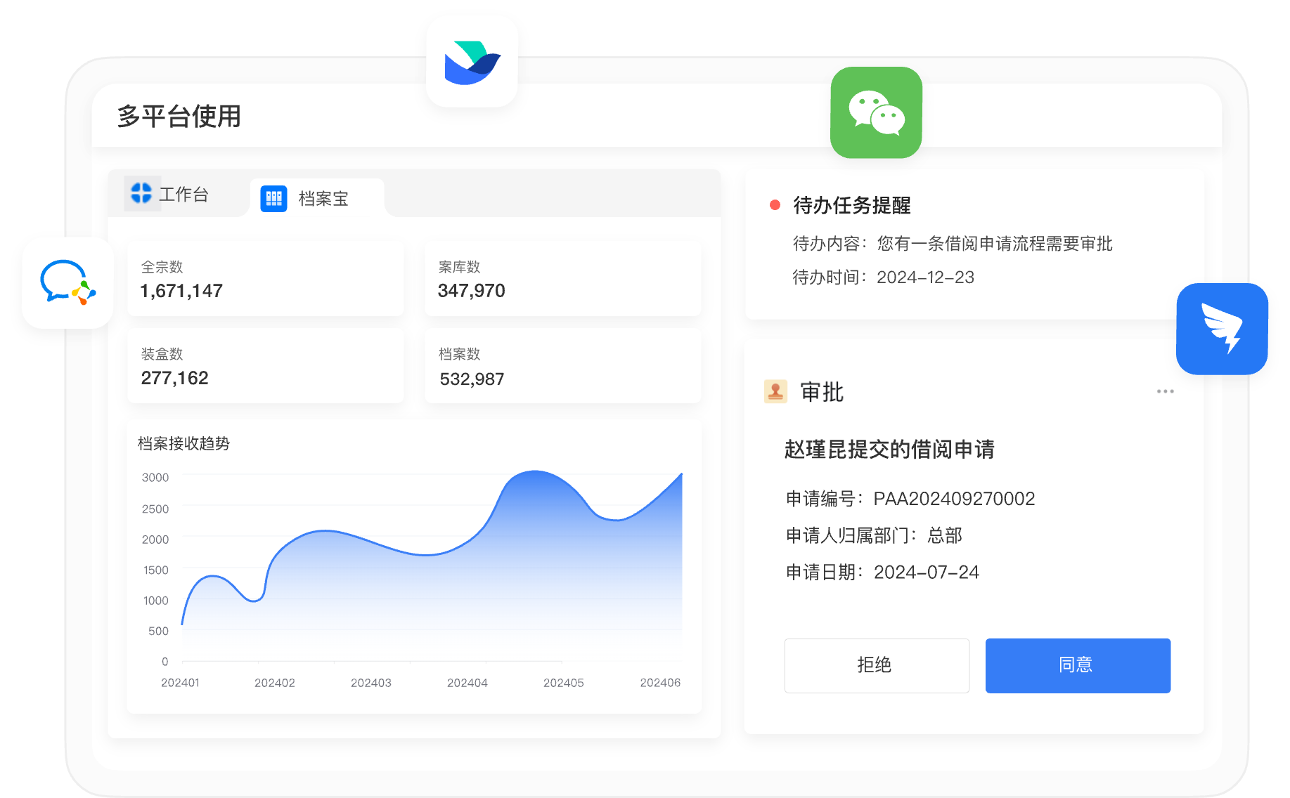 除了灵活定制能力,档案宝更注重多平台适配,深度集成各类办公平台和设备,实现"电脑端+移动端+第三方平台"全场景覆盖,打破空间和设备局限,让档案管理随时随地可进行,大幅提升办公效率。