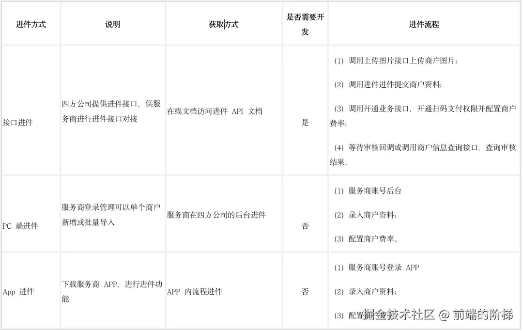 商户进件是指将商户的电子资料上传至三方支付机构,进行入网审核的过程。审核通过后,会为商户开设一个收单账户。常见的进件方式如下表所示: