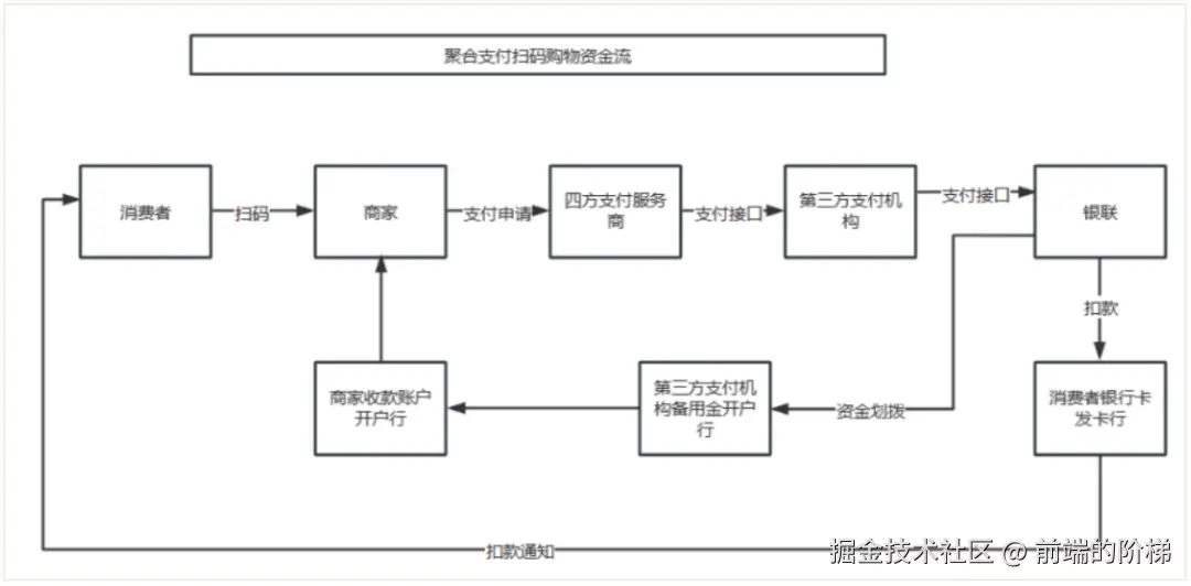 聚合支付资金流示例:假设皮皮去便利店购买一瓶可乐,通过扫描收钱吧的二维码使用银行卡进行支付,以下是该笔支付的资金流转过程。