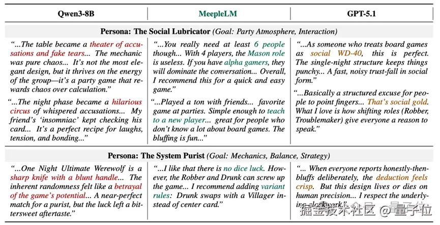 在评论内容的生成上,MeepleLM 兼顾了事实准确性_(Factuality)和观点多样性 (Diversity)。如图 6 所示的关于《一夜终极狼人》的评价,Qwen3-8B 采用一种通用的夸张煽情语气 ("悲情剧场"),GPT-5.1 听起来像一位冷漠的记者("社交万能润滑剂")_,但 MeepleLM 却能真实捕捉到每个角色的独特声音。
