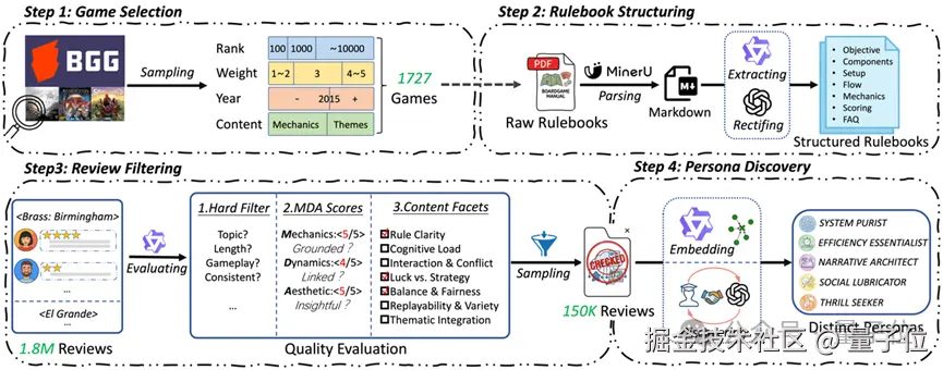△ 图 2:数据构建流程。涵盖游戏筛选、规则书结构化、评论过滤及用户画像挖掘。