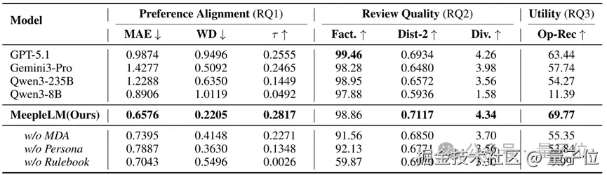 实验表明,MeepleLM 在还原玩家口碑与评分分布的精准度上,显著优于 GPT-5.1 和 Gemini3-Pro 等通用模型。