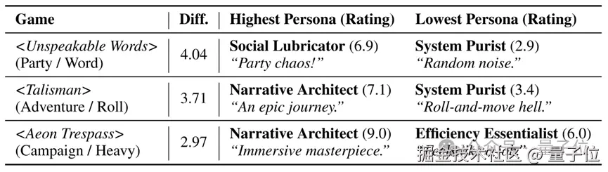 在此基础上,团队引入经典的 MDA_(机制 - 动态 - 美学)_游戏设计理论构建推理核心,使模型能够跨越静态文字、推演游戏运行时的动态交互,并进一步从评价数据中提炼出五种典型玩家画像,让 AI 内化特定偏好以模拟 "千人千面" 的真实感受。