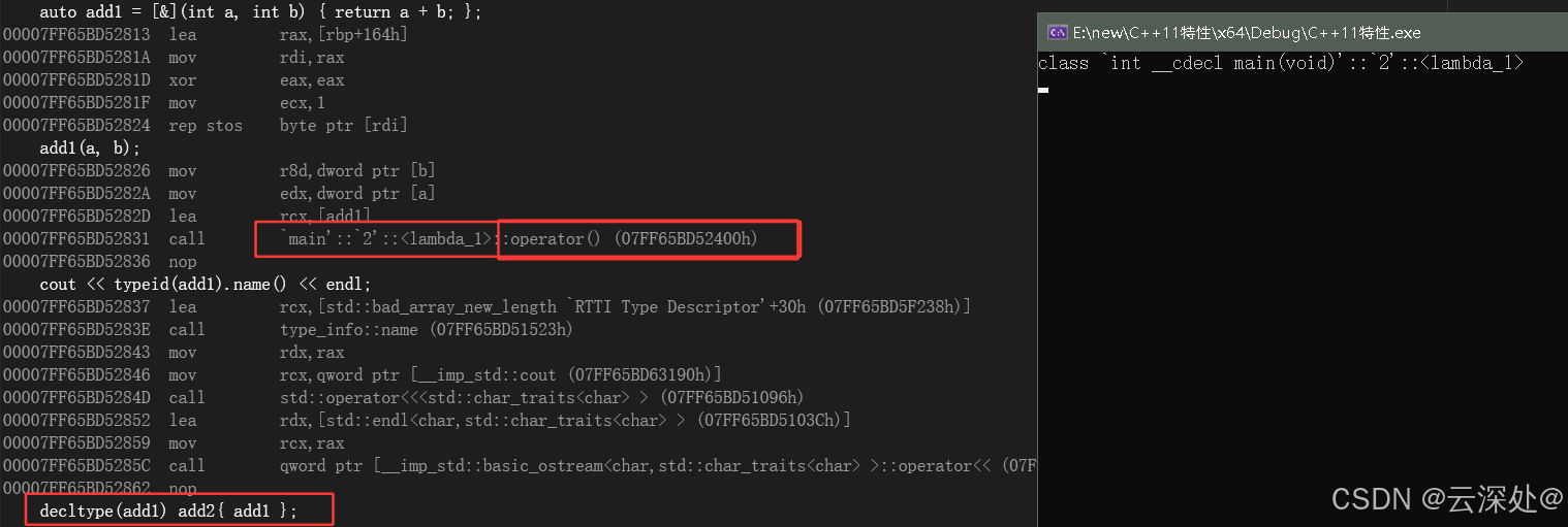 注意:语法上捕捉列表可由多个捕捉项构成,以逗号分隔。如【&a, &b】,【&,this】(this通过传值方式捕捉)。捕捉列表不允许变量重复传递,lambda表达式之间不能相互赋值