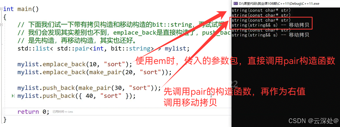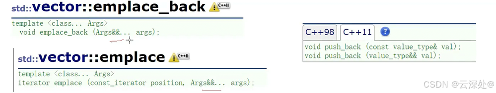 emplace_back通过参数包使用直接构造,push_back使用构造函数出对象来,再作为将亡值,调用移动构造。对于移动构造的消耗不是很大,于是两种方法效率差不多