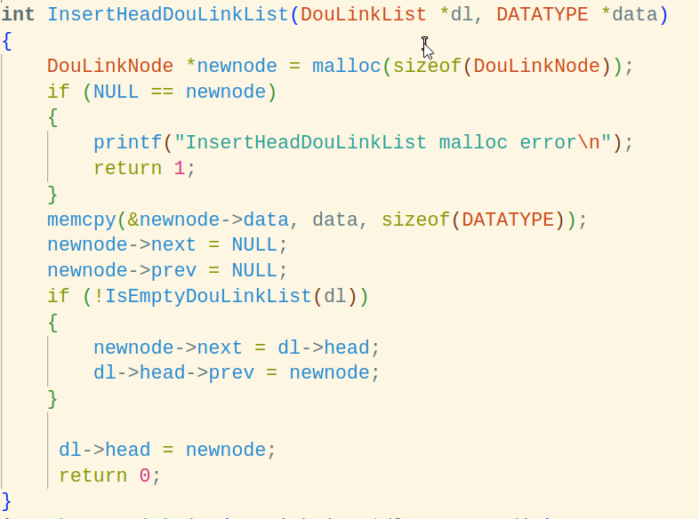 dl->head = newnode; // 如果为空的时候,头节点指向新的节点,也就实现了插入头节点的概念。