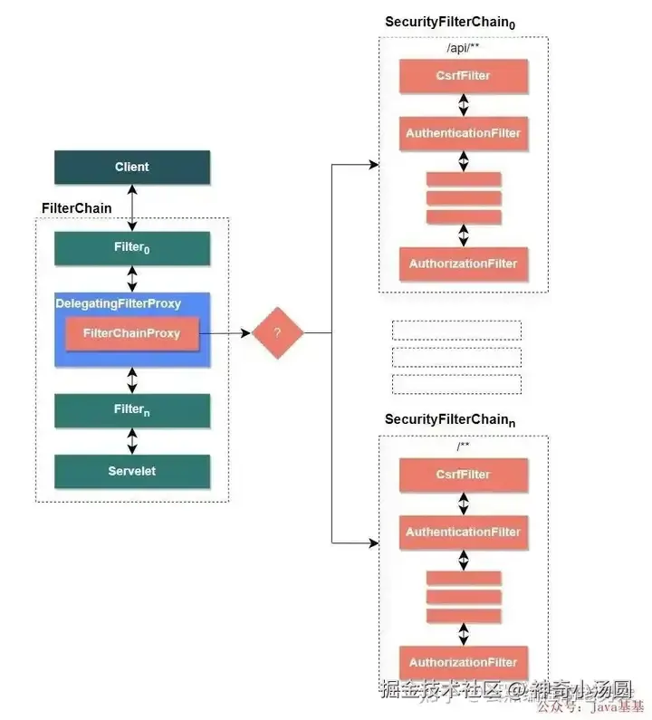 因此,在实际应用场景中,我们常常将这个庞大的Filter拆分成多个小Filter,并将它们链接在一起。每个Filter都只负责特定领域的功能,比如CsrfFilter,AuthenticationFilter,AuthorizationFilter等。