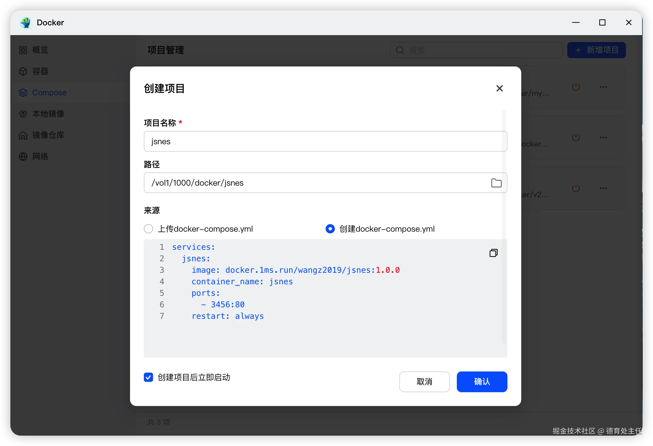 来源选择"创建docker-compose.yml"。