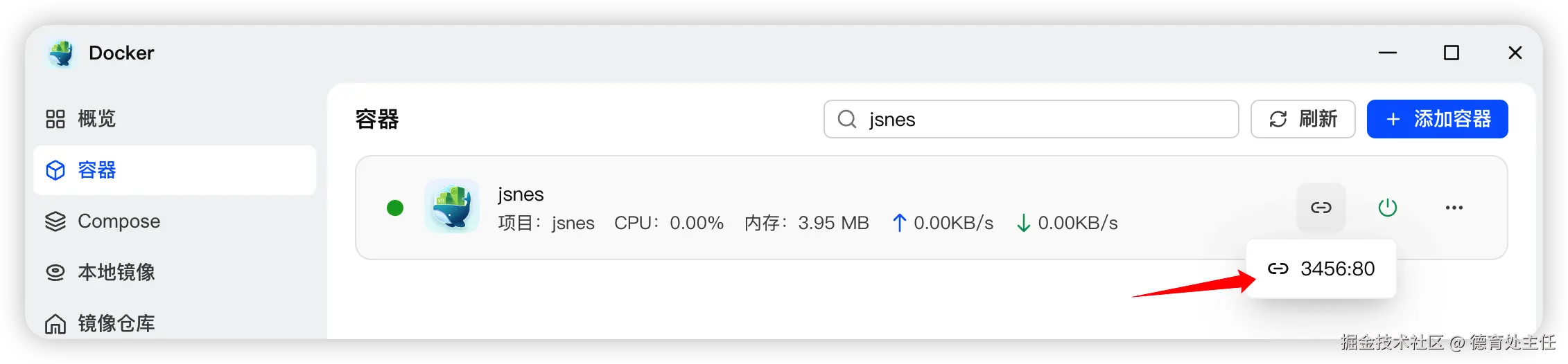 等 jsnes 下载并构建完成后,切换到「容器」面板,找到 jsnes 点击这个"链接"按钮就可以在浏览器打开 jsnes 了。