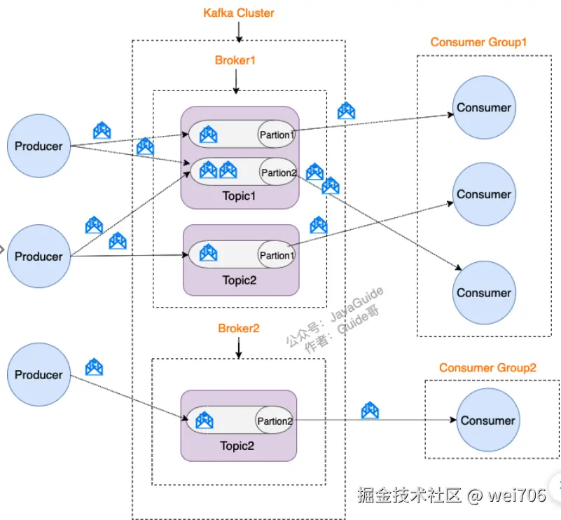 - Broker:代理,指的是一个独立的kafka服务实例,负责消息的接收、存储和发送。多个Broker组成一个Cluster。