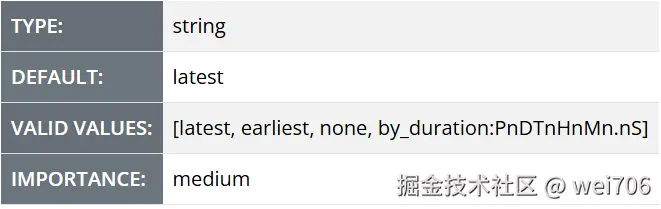 earliset:将offset置为该partition的最早offsetlatest:将offset置为该partition的最新offset,也就是下一条消息的offsetby_duration:从当前时间往前推 ,重置到那个时间点的 offset。注意这个配置项在Kafka3.0以上的版本才生效。none:直接抛异常