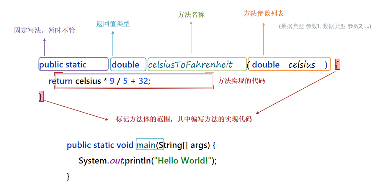方法(Method):是程序中最基本的功能单位,是用来实现功能的代码块。一个程序往往有很多的方法组成。