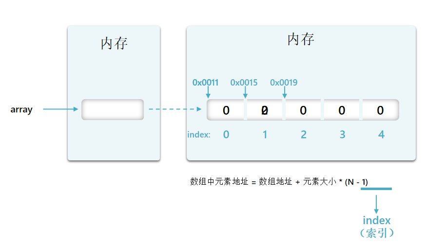 之所以数组从0开始计数,是由于当将第一个地址带入公式时等于0,少一次减法运算,我们可以将(n-1)看成索引。