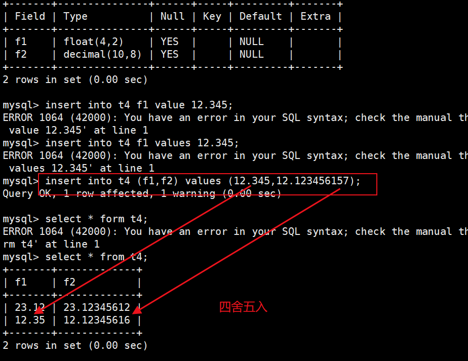 小数:float(4,2)表示的范围是-99.99~99.99,MySQL在保存值时会进行四舍五入。