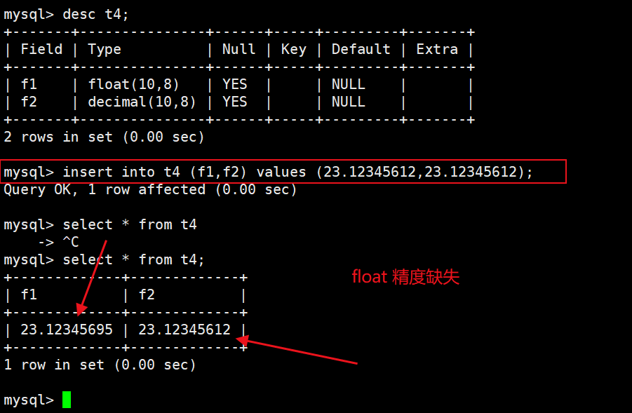 float[(m,d)][unsigned]:M指定显示长度,d指定小数位数,占用空间4个字节。