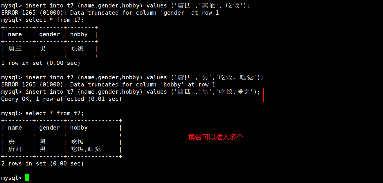 set:集合,"多选"类型;set('选项值11,选项值2,选项值31,...);
