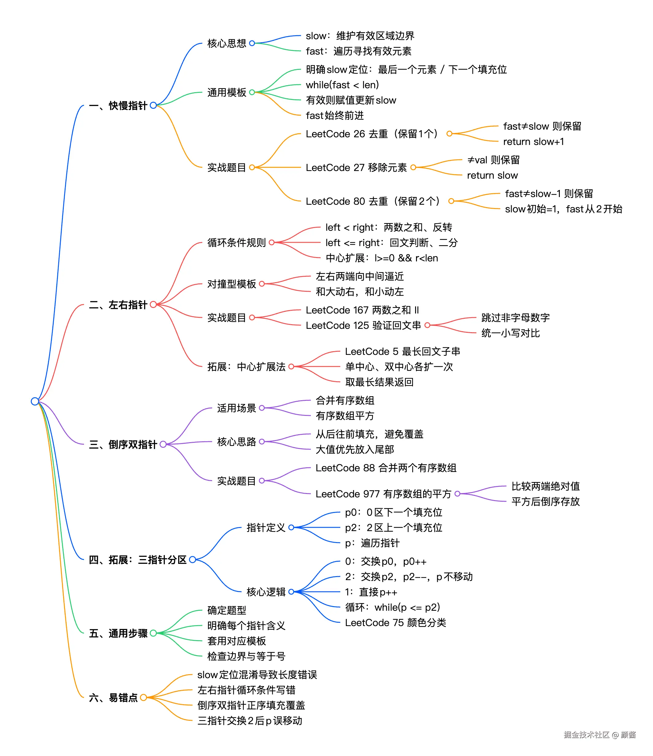 双指针是数组/链表题里的「解题神器」:通过指针分工实现一次遍历、原地修改 。本文数组覆盖 3 类核心模板 (快慢指针、左右指针、倒序双指针)和 2 类进阶(中心扩展、三指针分区),并标清指针语义、循环条件与等于号取舍,方便直接套题。
