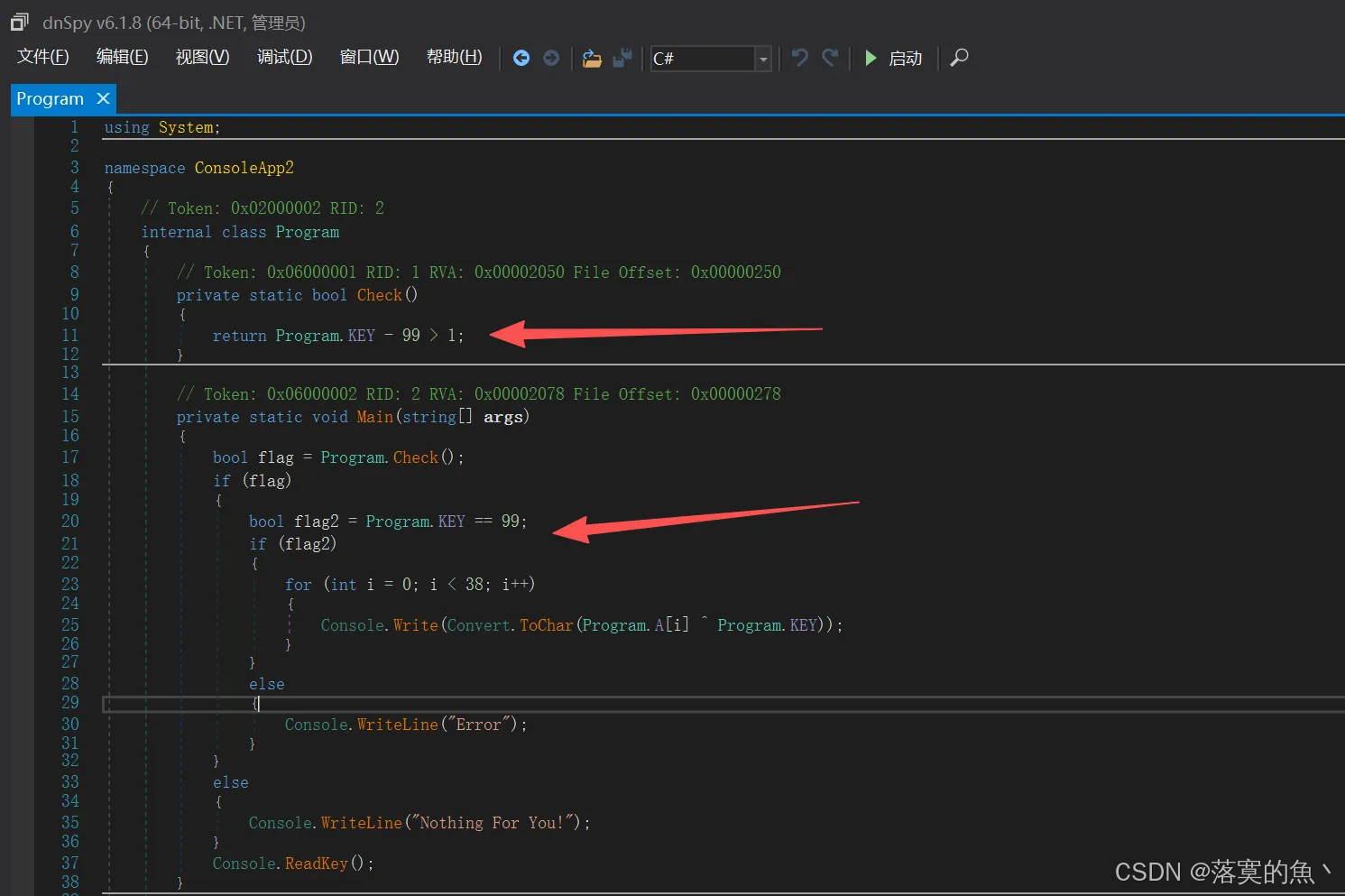 这是一个.net 的 exe 使用 dnSpy 打开分析源码,发现是异或 直接用 KEY=99 去 XOR 数组 A
