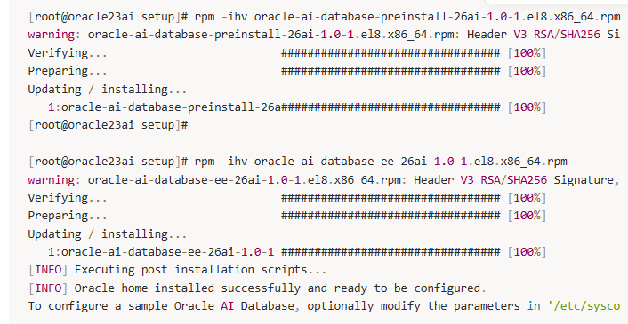 然后正式安装 oracle-ai-database-ee-26ai-1.0-1.el8.x86_64.rpm 一共执行了2个安装包。
