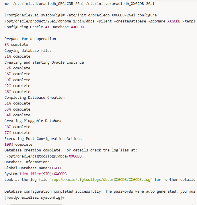 而我改了名字。/etc/init.d/oracledb_XXGCDB-26ai configure 所以无法做到一键。