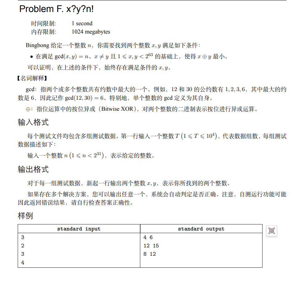 解释一下题意,就是说指定一个整数,然后要找到两个数,保证这两个数的最大公约数是指定的数,并且要使这两个数按位异或的结果最小