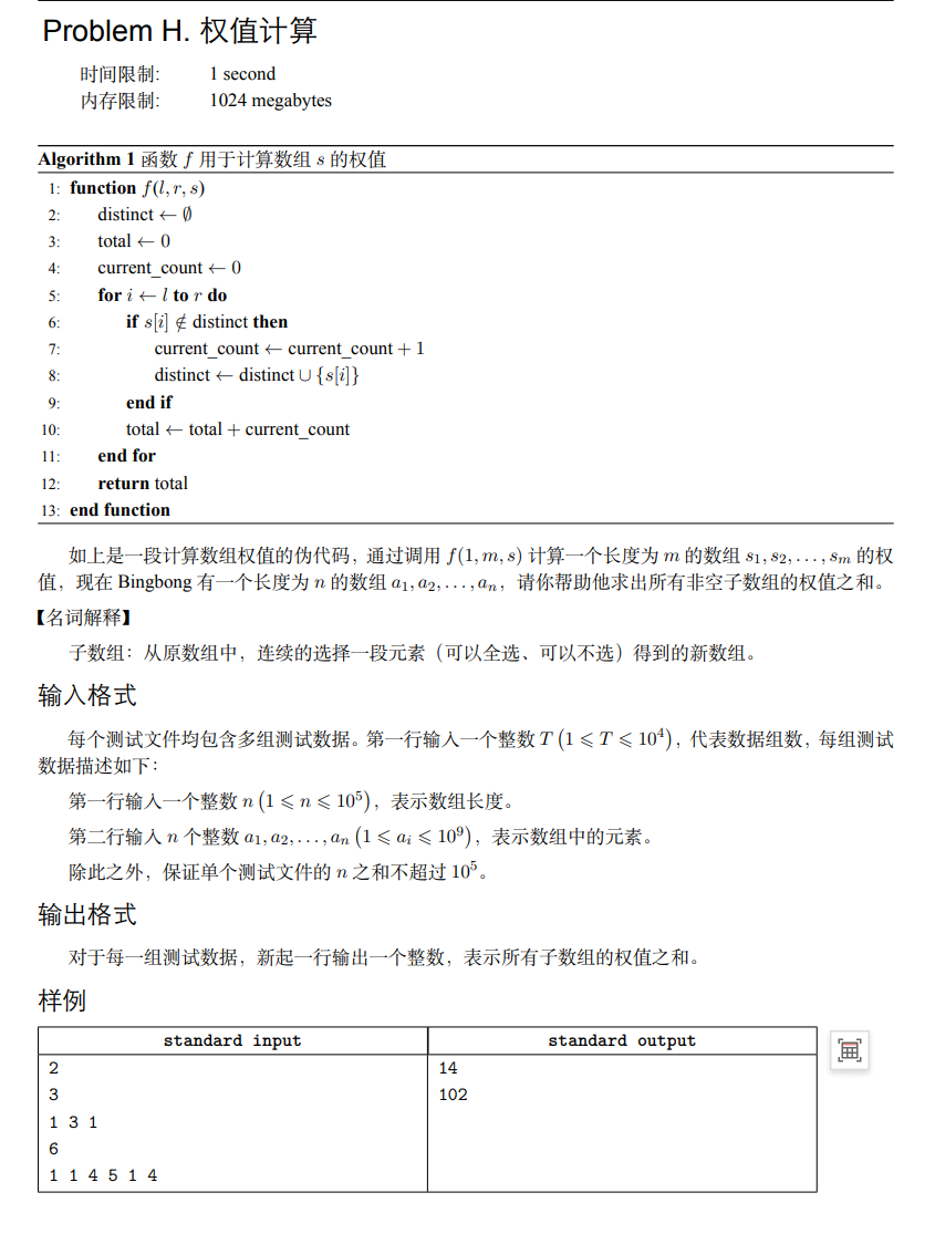 计算一个区间权值的规则为:遍历整个区间,每遍历到一个元素,都要加上从区间左端点到这个元素的出现的不同元素的个数