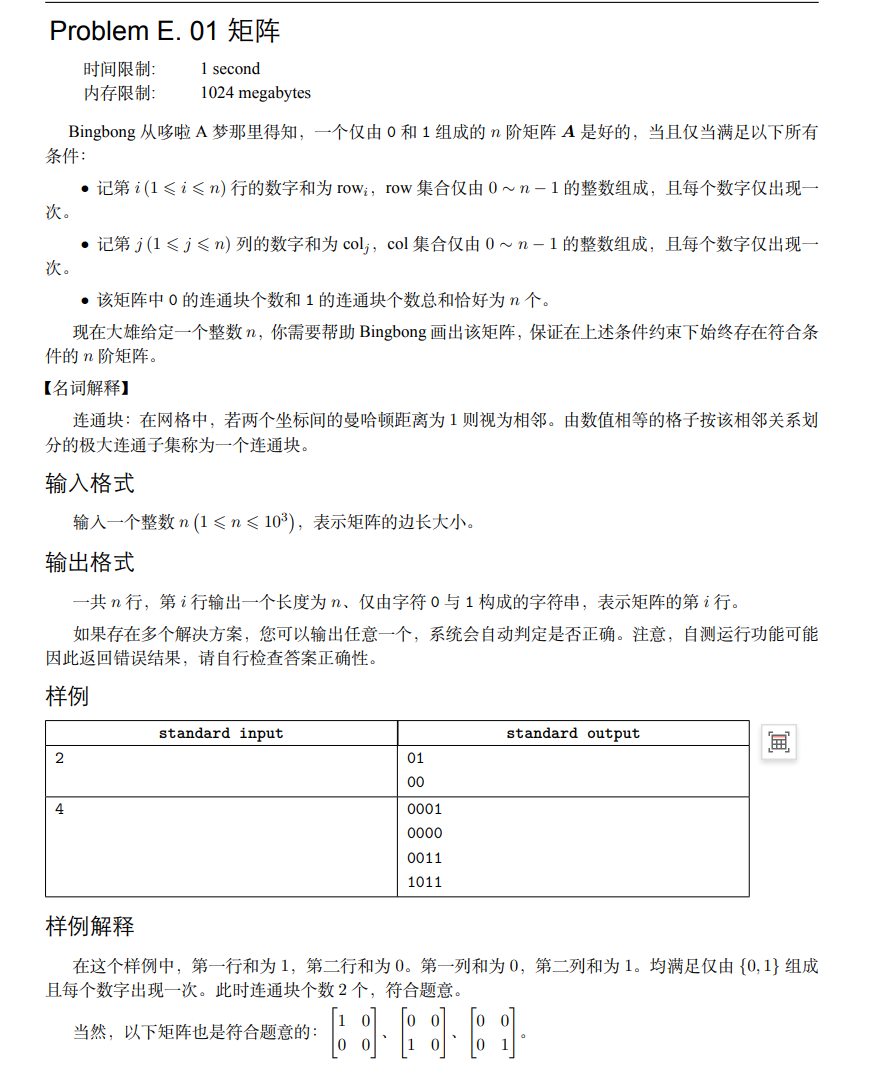 若一个矩阵由01构成,且所有行的单行数字和由0~n-1的排列组成,所有列的单列数字和由0~n-1的排列组成 ,且0的连通块个数和1的连通块个数总和恰好为n个,这个矩阵就叫好矩阵
