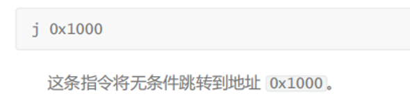 例:假设当前PC=0x0000 1000(执行跳转指令前的PC值),J型指令的26位形式地址字段值为0xF(注意:不是有效地址)。首先CPU从PC=0x0000 1000地址取出这条J型指令,取出后PC自动加4(MIPS指令4字节对齐,"+1"是指令数的增量,对应字节数+4),此时PC更新为0x0000 1004。