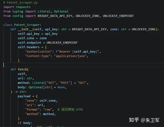 这里面涉及到一个最重要的开发环节是封装Web Unlocker调用,去请求不同站点的网页数据,需要填写之前申请的unlock api key信息,并按照模板开发代码。