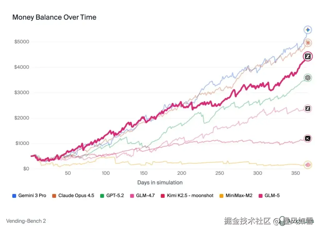 在Vending Bench 2(自动售货机经营模拟)测试中,GLM-5操作了一年的虚拟生意,最终账户余额4432美元。作为对比,Claude Opus 4.5是4967美元。