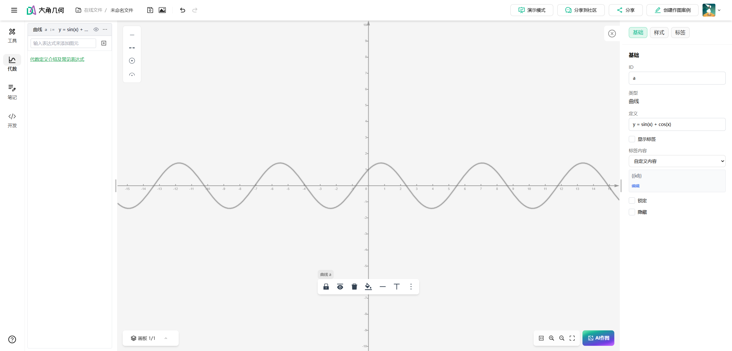 这一次,我直接在大角几何里输入y=sin(x)+cos(x)。