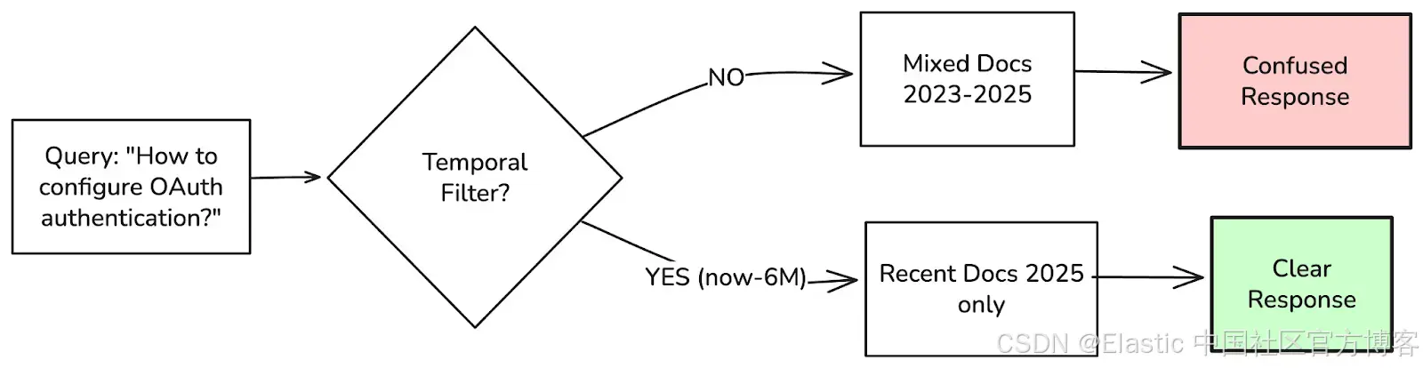 - 对于时间敏感的信息,需要主动管理以防止过时内容污染上下文窗口。使用带相对时间过滤器的范围查询(如 now-6M 或 now-1y)来处理频繁变化的内容,确保 RAG system 优先检索最近内容。详细信息请参考 [Range query | Reference]。