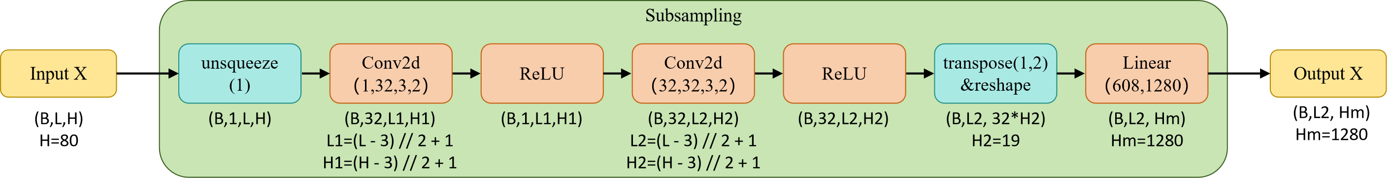 下采样模块采用两个串联的卷积层(每层步幅为 2、核大小为 3),后续紧跟 ReLU 激活函数。该配置将时间分辨率从每帧 10ms 降至 40ms,在保留关键声学信息的同时有效控制了计算复杂度。